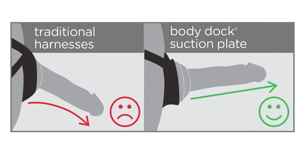 The simple strap-on features a docking system with a docking plate that fits perfectly to the body. The included dildos can be attached with ease and withstands even the most furious action without the risk of falling off (Push & Play). The plate distributes the pressure evenly across the pelvis area, avoiding any unpleasant sensations during wear and play. The wide straps offer a secure and comfortable fit that can be adjusted to fit with the plastic sliders. Any other Dillio Platinum and many other suction cup dildos are compatible with the dock.