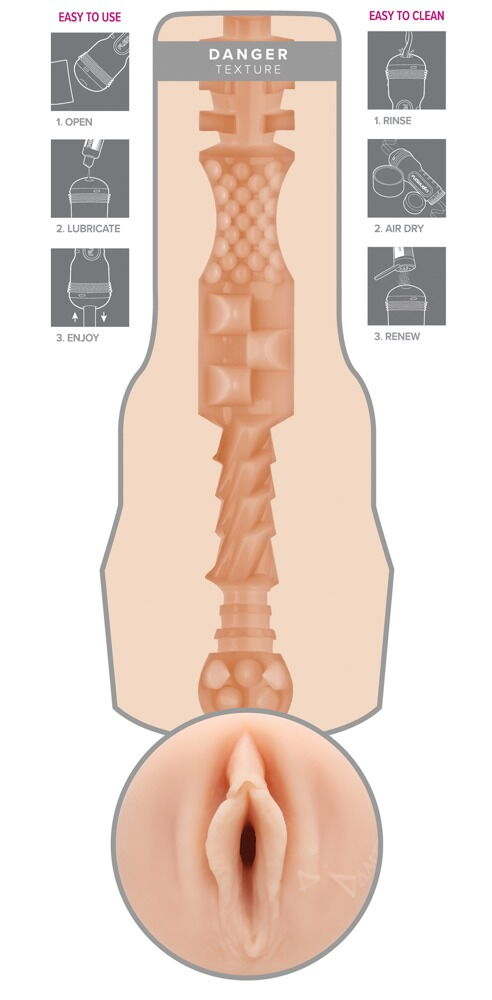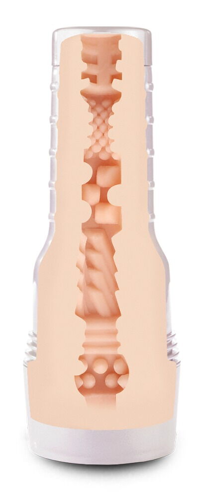 Masturbator with a vagina opening in a pearl-white case. With a realistic replica of erotic star Abella Danger's private parts. The inside of the pleasure tunnel offers an extremely stimulating combination of differently-sized dots, ribs and grooves. With a covering cap and the star's signature right next to the labia. Superskin texture.