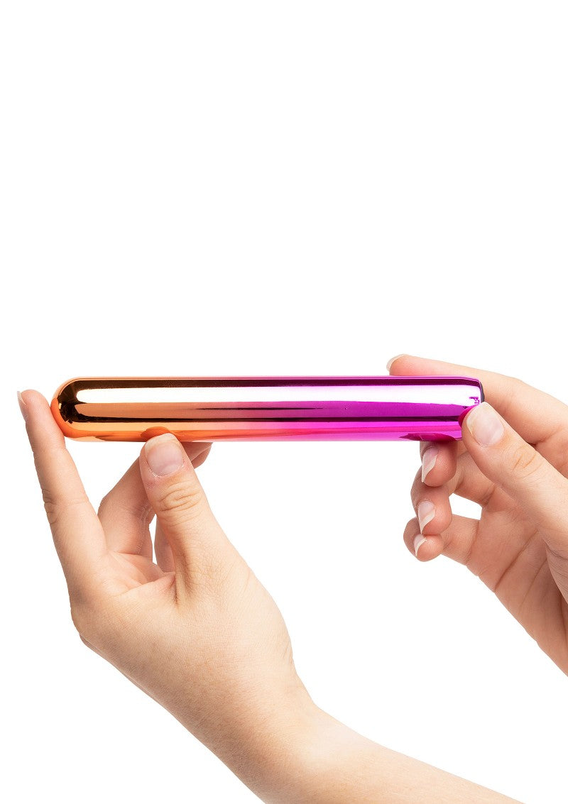 Beneath the Aluminium Rumba’s design are two astonishingly powerful motors for double the pleasure. While we designed this double-motored vibe with our true power users in mind, we didn’t stop there. For those who covet a new sensory experience and enjoy a little temperature play, the Aluminium’s gentle warming feature is sure to satiate your needs. Whether you’re feeling adventurous and want to try both heat and vibration simultaneously, or prefer to experiment with either sensation individually, the choice is yours! The bullet’s features can be operated independently, allowing you to customize your experience. The Aluminium’s rainbow ombre finish and 60SX AMP proprietary motor—which commands 7 vibration speeds and 5 vibration patterns—mean you’ll never have to choose between pleasure and beauty again! What more could you want?