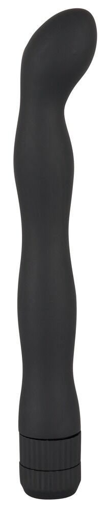 Wavy vibrator with rounded, slightly curved tip. Vibration continuously adjustable. Black. Length approx. 18 cm, Ø 1.7-2.4 cm. Material: ABS. (Please order batteries separately: 2 x AAA (Micro)