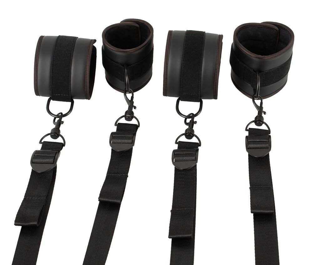 Every bed can be turned into a professional bondage playground with this bed restraint set. The cross that is made up of adjustable, tear-proof straps fit underneath any mattress. The handcuffs and ankle cuffs can be attached to the straps because there is a snap hook at the end of each strap. The comfortable handcuffs and ankle cuffs are in a characteristic leather look (but everything is completely vegan!). The handcuffs and ankle cuffs have hook and loop fasteners which means that they are suitable for HIM and HER.