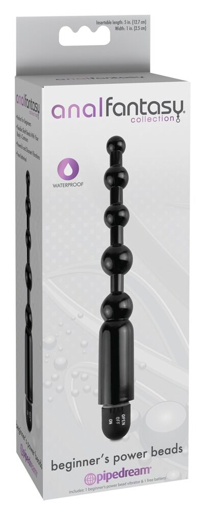 Anal vibrator in a gentle anal beads design. The smallest bead is at the end of the vibrator and the beads get bigger towards the base. The vibrations can be easily controlled at the bottom of the handle. The anal vibrator is also waterproof which means that it can be enjoyed in the bath or the shower. Includes a battery (N).