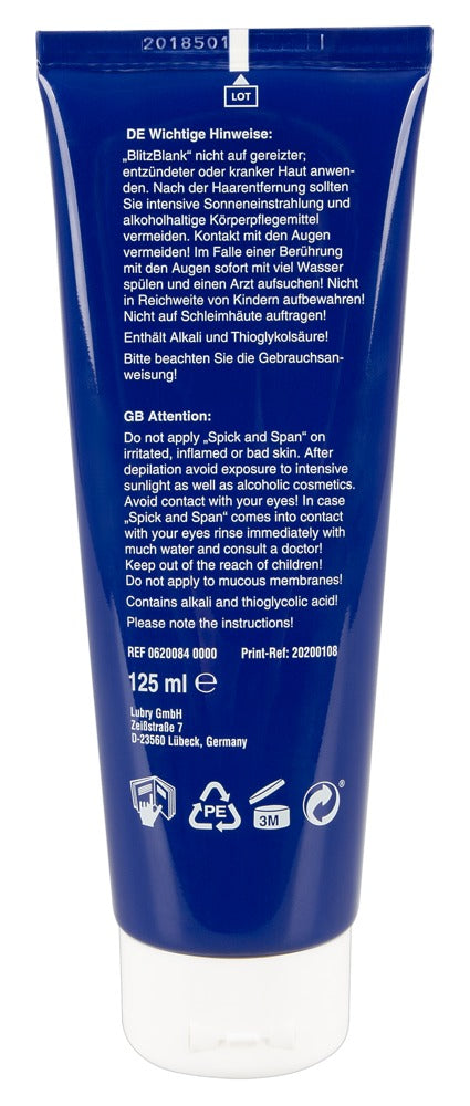 The BlitzBlank hair removal cream gently removes annoying hairs. The skin will become wonderfully smooth and it will look neater and tidier as well. Just apply a generous amount of the BlitzBlank cream on the area where the hair is to be removed. Wait for 10 to 20 minutes (depending on the thickness of the hairs) and then remove all of the hairs with the included spatula. Rinse the area afterwards with water. Fragrant cream.