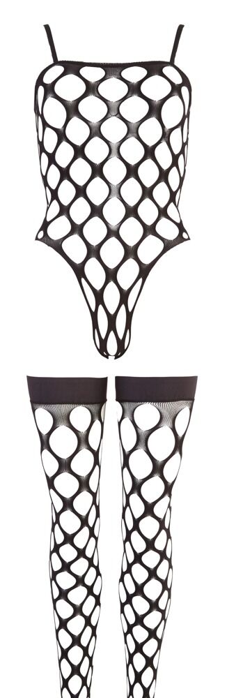 G-string body and stockings in a set. Made completely out of black, elastic, soft fence net, seamless. Stockings with a silicone lining for a non-slip fit. 90% polyamide, 10% spandex.