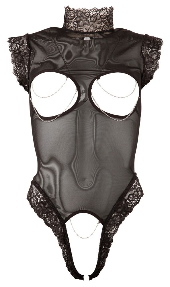 Black transparent body with lace trimmings on the sleeves, collar (2 buttons at the back) and around the legs. Breasts and crotch are open and decorated with detachable chains. Black. 90% polyamide, 10% spandex.