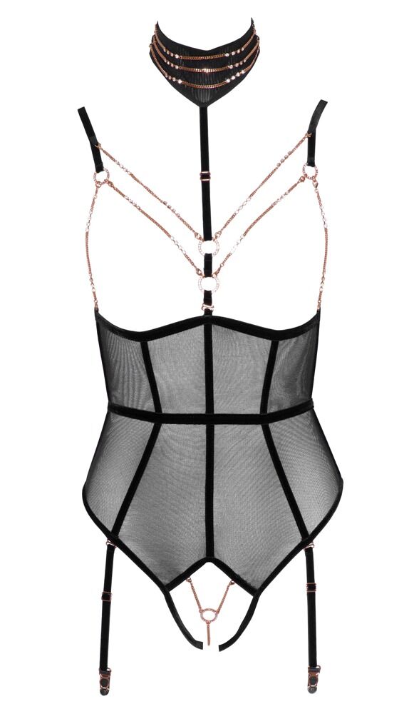 Open cup, powernet body from Abierta Fiena with a completely open crotch area, stretchy velvet straps and rose-gold coloured decoration. The bra and suspender straps can be adjusted. The suspender straps can be removed. There is an adjustable cleavage strap and a choker (with a button at the back) that has decorative chains around it. The cleavage strap and choker are also removable. The small chains in the cleavage area with snap hooks and the chain in the crotch area with a decorative ring are also removable. The back of the body is in a 2-piece look. There are two clip fasteners on the bra and a panty/suspender belt waistband.