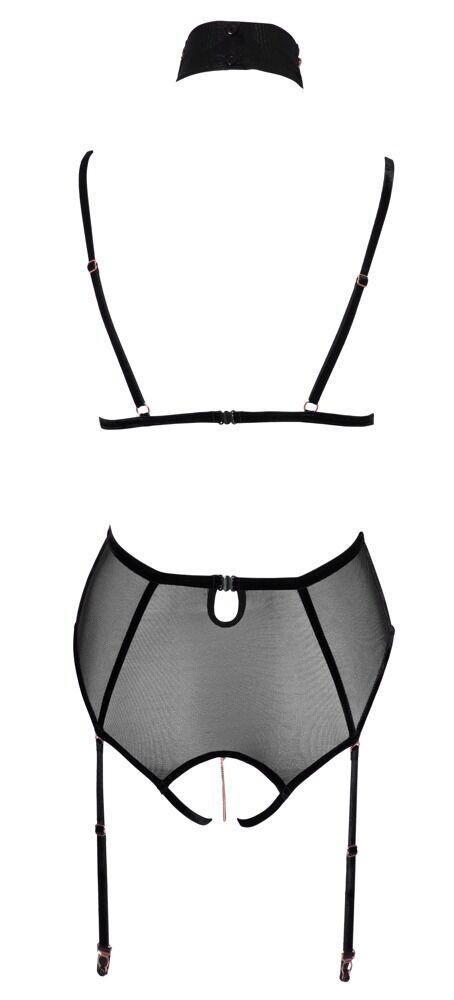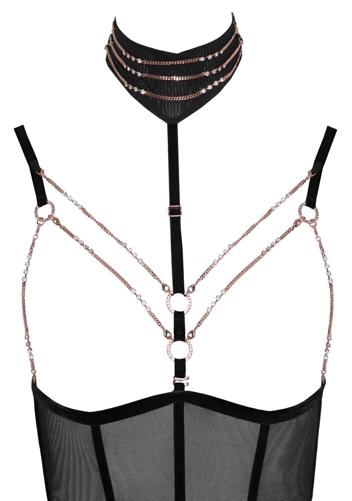 Open cup, powernet body from Abierta Fiena with a completely open crotch area, stretchy velvet straps and rose-gold coloured decoration. The bra and suspender straps can be adjusted. The suspender straps can be removed. There is an adjustable cleavage strap and a choker (with a button at the back) that has decorative chains around it. The cleavage strap and choker are also removable. The small chains in the cleavage area with snap hooks and the chain in the crotch area with a decorative ring are also removable. The back of the body is in a 2-piece look. There are two clip fasteners on the bra and a panty/suspender belt waistband.