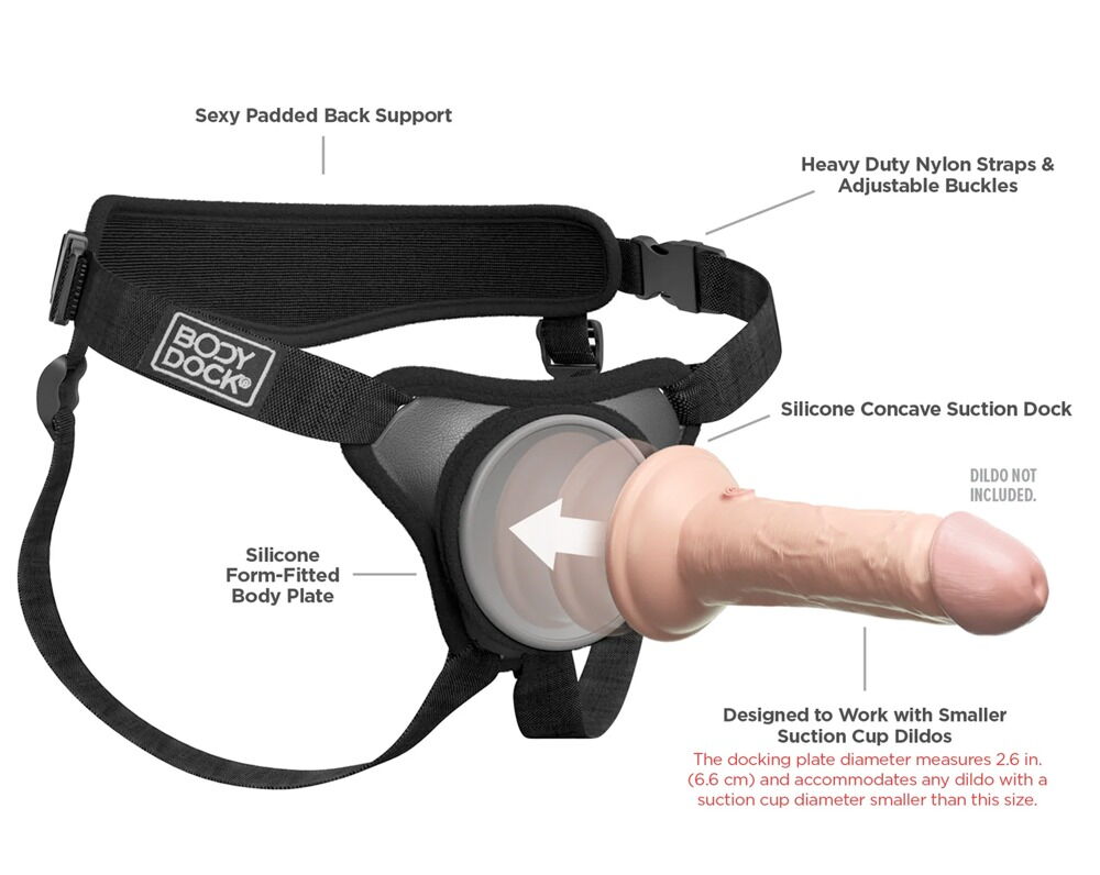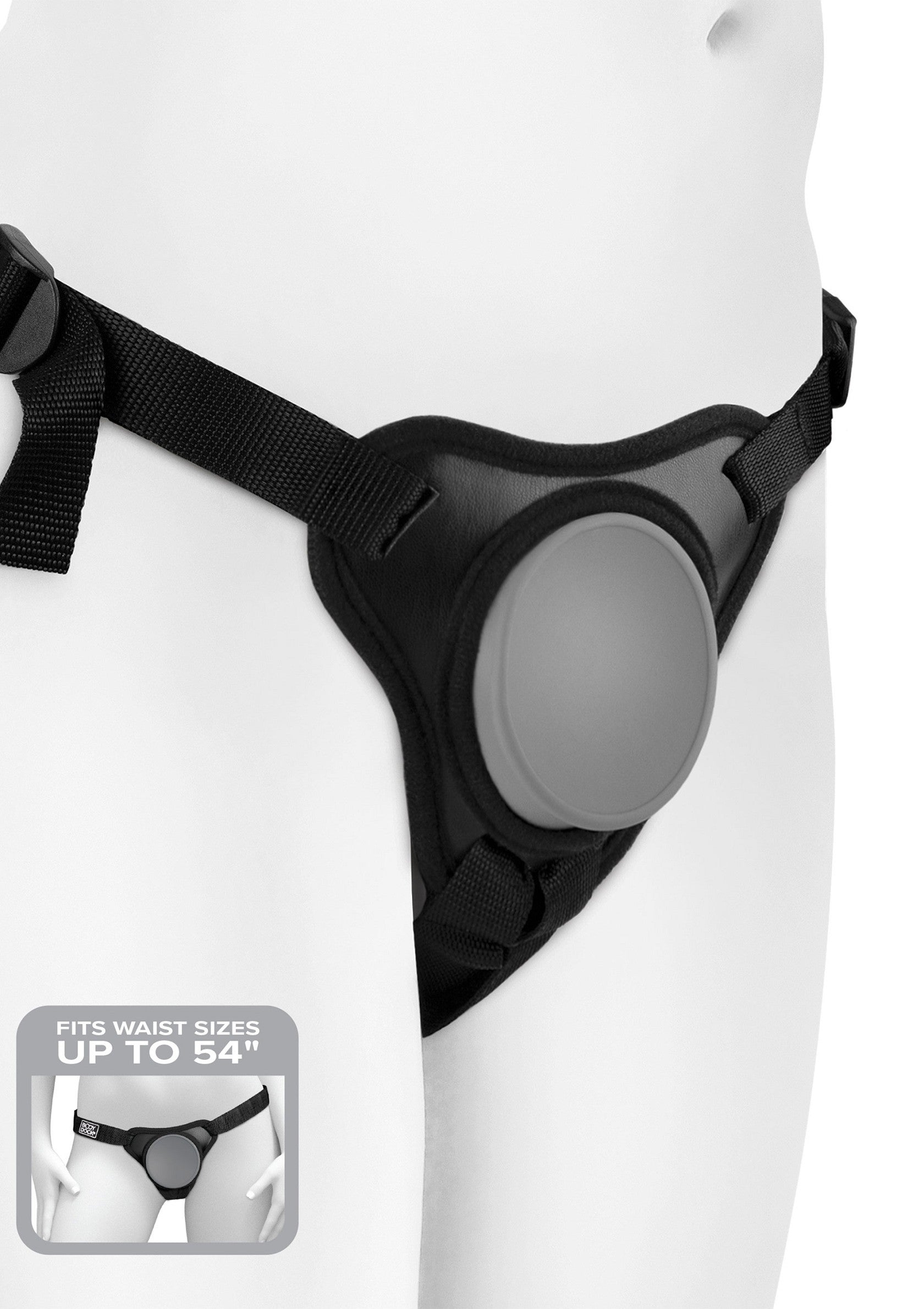 The simple strap-on system has an anatomically curved docking plate for attaching suction cup dildo or vibrator (not included). The dildo/vibrator is held securely in position (Push & Play). The padded docking plate distributes the pressure evenly over the pelvic area to avoid any unpleasant pressure. In this Elite Mini version, the back strap is softly padded for even greater comfort and the internally padded docking plate is made of silicone. It adapts perfectly to the anatomy and movements. The sturdy straps are adjustable with plastic sliders for a firm and comfortable fit.
