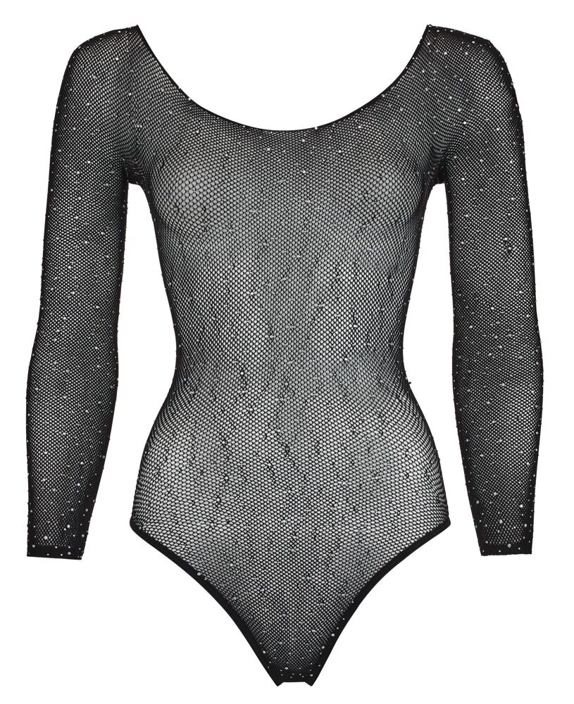 Soft, long sleeve body made out of very stretchy net. The body is covered in sparkly gems that are in various sizes. The cuffs and neckline are strengthened. There are stretchy straps integrated into the material around the legs. Seamless and extremely stretchy for a comfortable fit.