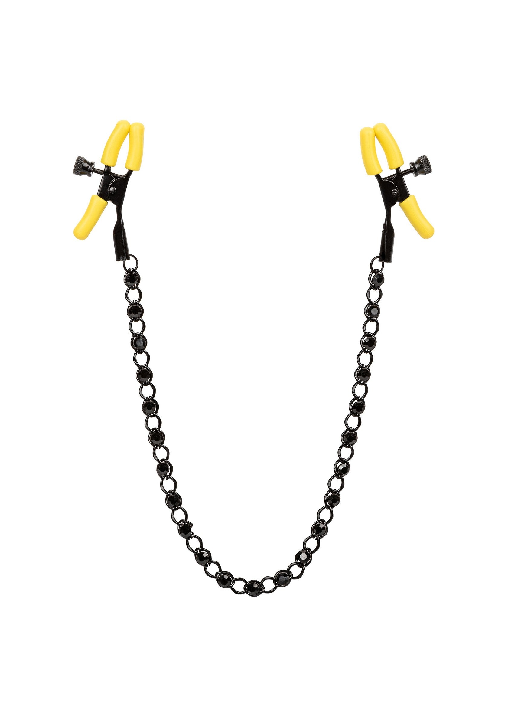 Push yourself towards endless pleasure and embrace the teasing stimulation of the Boundless Nipple Teasers. Explore elevated sensation with the 2 fully adjustable nipple clamps, sensual chain and sparkling crystals. Reach new levels of playful pleasure with the adjustable clamps. Clamp the naughty clasps to your body and enjoy every rush of pain and pleasure. The clamp has adjustable tension to stimulate anywhere on your body for playful teasing. As the tension tightens, the tingles intensify with every turn of the dial for the ultimate in nipple stimulation toys. With the teasing clamps, you can look forward to amplifying nipple sensitivity and intensifying overall arousal. These easy-to-use nipple teasers are great for everyone. The two adjustable clamps are made from body-safe materials and feature soft, comfortable silicone pads.