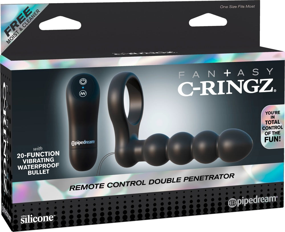 Tight-fitting cock ring with a securely integrated, beaded anal vibrator. Once the cock ring goes over HIS penis, he'll have a second penis – perfect for giving her double the amount of pleasure! The cock ring supports his erection effectively because of the blood congestion effect. The anal vibrator's 20 vibration modes can be easily adjusted with the remote control. Batteries: 2x AAA (not included). Batteries: 3x LR44 (included).