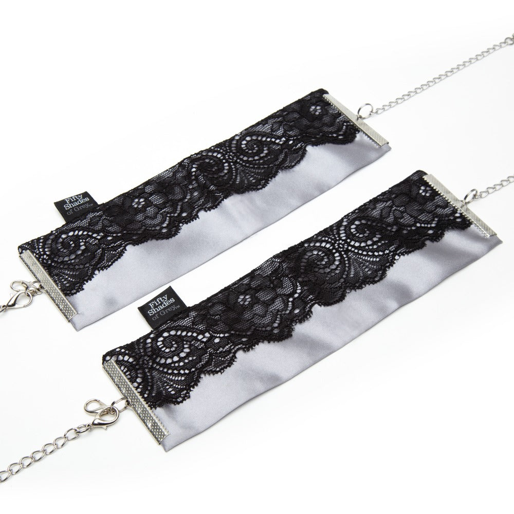 The elegant Play Nice Satin & Lace Wrist Cuffs from Fifty Shades of Grey have a removable connection chain with snap hooks. The comfortable handcuffs are made out of siliver-coloured satin which is decorated with delicate eyelash lace. The circumference of the handcuffs can be adjusted.