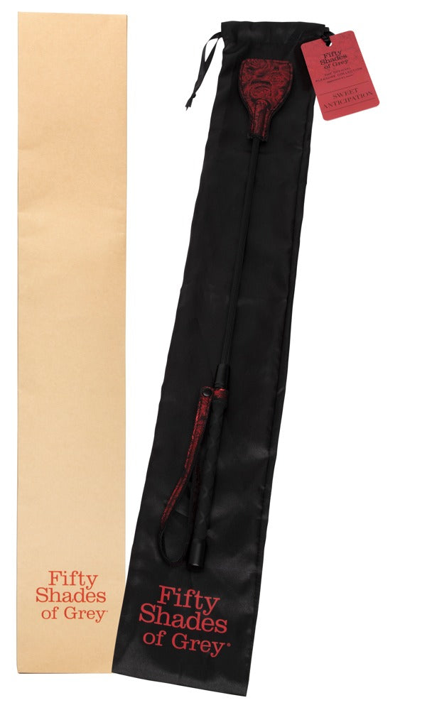 High-quality crop Sweet Anticipation Riding Crop from Fifty Shades of Grey with differently textured sides: one side is in a black leather look and has a coarse texture, the other side is smooth and in a black/red satin rose design. The sturdy, long handle with wrist loop allows for controlled swings and pleasurable spanks.