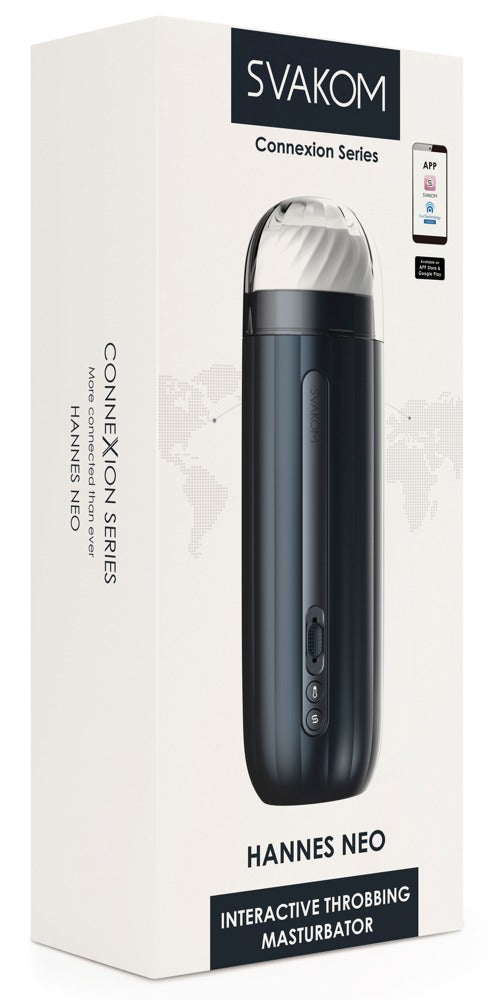 Fully automatic pulsating masturbator Hannes Neo by SVAKOM with removable textured sleeve for an intense penis massage. With a deep throbbing function in 5 intensities and an additional heating function, which contributes to a particularly realistic experience. Everything can be conveniently controlled at the touch of a button/slider (infinitely variable speed) directly on the toy or via the FeelConnect 3 app on your smartphone with 3 main functions: Long Distance Control (anytime from anywhere in the world), connection to interactive 2D videos and an interactive webcam function.