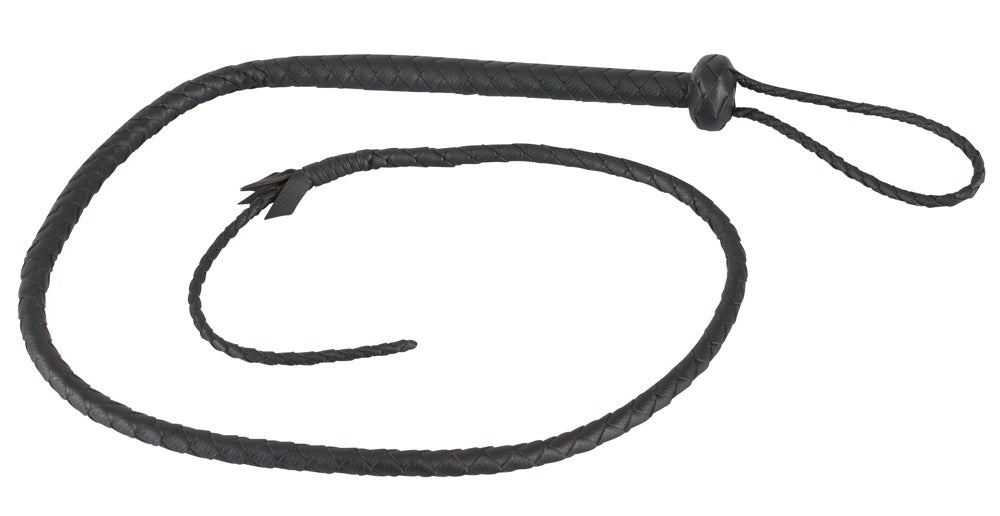 For extensive play around power and submission. Whip made of black leather. With one strap and an attached tip. Total length (without wrist loop) 132 cm.