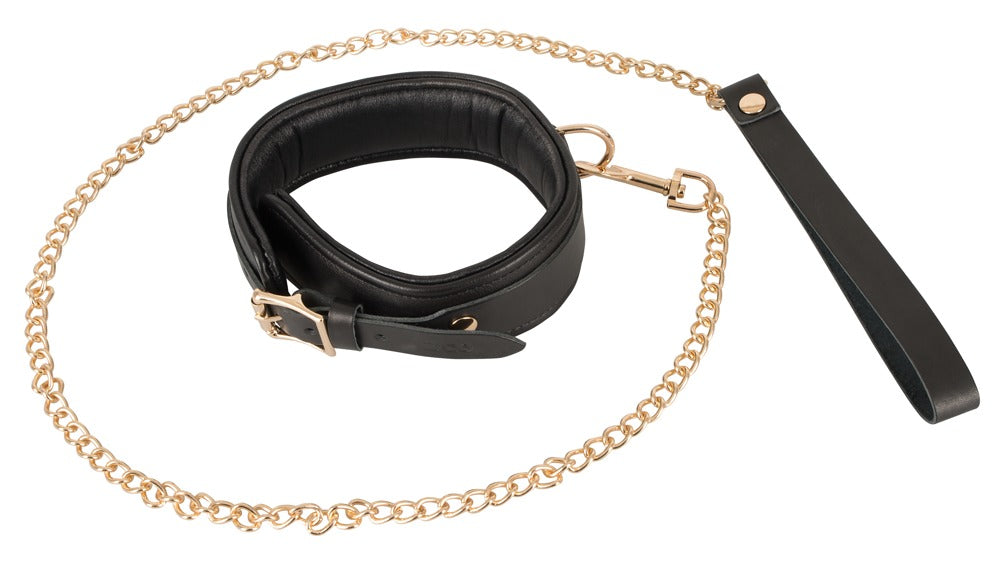 This collar is made out of extremely high-quality leather (chrome-free tanned). The collar is padded on the inside and fits comfortably around the neck. The leather's beautiful look is emphasisied by the gold-coloured details on the buckle and the chain. The collar and leash are perfect for anyone who likes being extravagant.