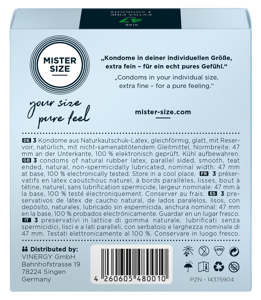 Transparent, extremely thin Mister Size condoms (47 mm) made out of natural rubber latex. The condoms are covered in lubricant and are teat-ended. Vegan.