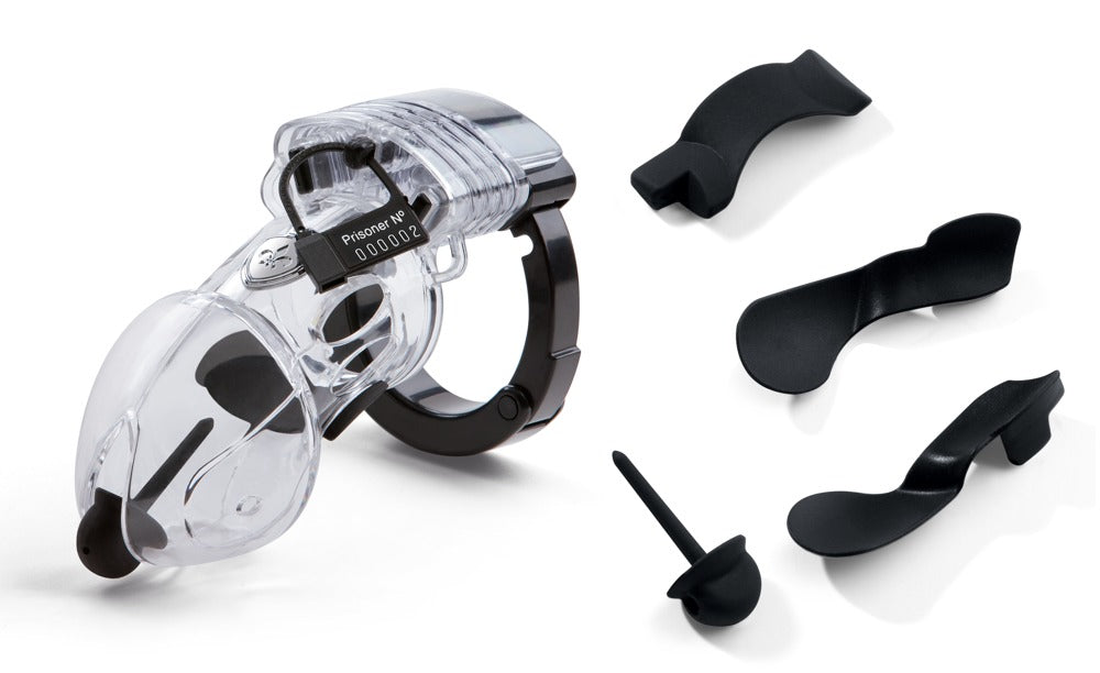 Transparent, solid penis cage with a clamp, fixation disk, three spacers, a metal lock with two keys, 1 removable dilator, electrode cable, 5 plastic seals and ten possession signs. Material: silicone, PC, ABS. Accessory for the stimulation device Tension Lover (05289270000) and Pure Vibes (05297610000). Everything comes in a black hardcover case.