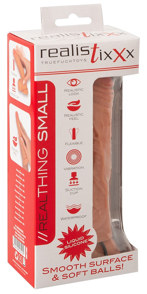 This bulging, realistic guy Real Thing Small from Realistixxx stands out because of its realistic design, its pronounced glans and veins, and its round testicles. Its flexibility and the 3 different vibration modes means that it is an exciting lover. The vibration modes can be controlled via the remote control on a wire. It is also made out of extremely soft silicone that feels wonderfully soft to the touch. It has a suction cup which means that it can stick to smooth surfaces making hands-free pleasure possible. Please order batteries separately: 2 x AA.